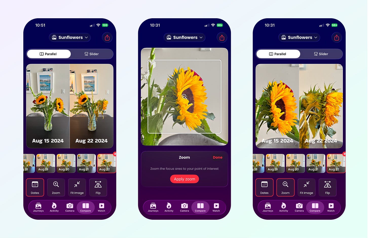 I shipped a zoom feature for PhotoJourney this week. The app has a photo compare screen where you put two photos side by side or use a swipe-to-reveal slider to spot differences over time, and I wanted to let people pinch into a specific area to compare detail up close. Check out the finished feature in the demo video below, or in the app.