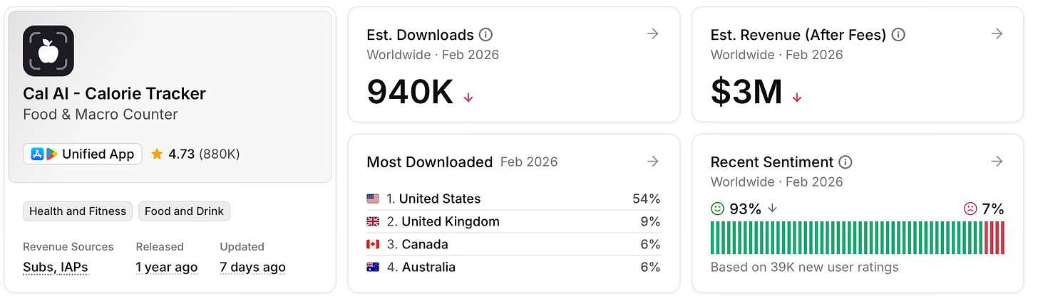 According to AppFigures, Cal AI reported over 900,000 downloads in February alone with an estimated $3 million in monthly revenue. That doesn’t happen because of the AI technology they used to build it. That happens because of distribution. Excellent social content, aggressive paid marketing and smart positioning.